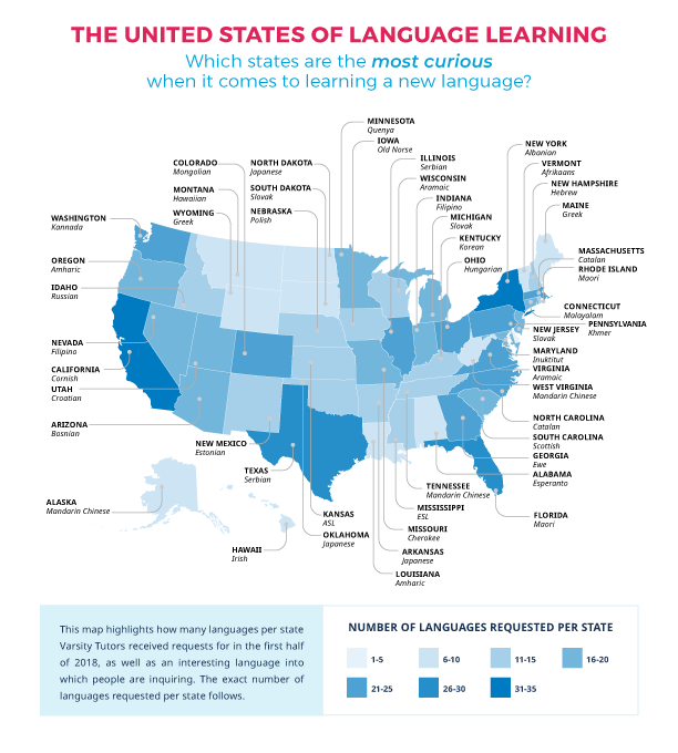 The map below highlights how many state-specific language inquiries Varsity Tutors received in the first half of 2018, as well as an interesting request in each state. California led in diversity with 35 languages requested, and New York followed with 31.