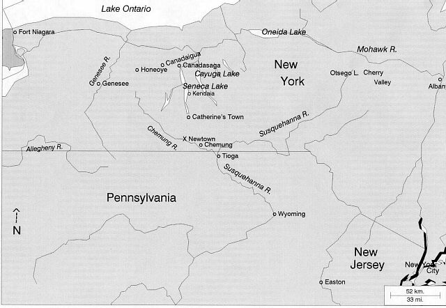 The plan was simple. Sullivan would gather his forces near near Easton, Pennsylvania and advance up the Susquehanna River Valley. Simultaneously, Clinton's Brigade would sweep westward from the Mohawk River Valley and down the upper Susquehanna to link up with the main force at Tioga. From there, the combined force would travel into the Iroquois country and destroy everything in its path. Washington also hoped that another column could be organized to invade Iroquois country from the western Pennsylvania' Allegheny River.6 (Fig. 1)