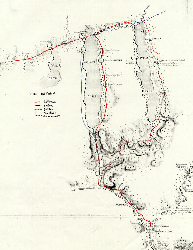 With the Iroquois threat largely removed, Sullivan divided his force cover more territory. Colonel Peter Ganesvoort and about one hundred men would continue marching eastward to the Mohawk Valley, destroying villages along their path to Albany. Colonel Henry Dearborn and seven hundred men marched down the western shore of Cayuga Lake, while simultaneously, Colonel Walter Butler and five hundred men traveled down its eastern shore. The two forces would link up with Sullivan above Tioga. A fourth force under Colonel William Smith swept along the western shore of Seneca Lake, while Sullivan, and the remainder of the army, covered its eastern side. (Fig. 3)