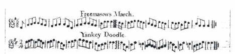 How old and mysterious its origins are we can only imagine from the 1730 manuscript tune-book of Reverend James Pike, pastor in Somersworth, New Hampshire.  One page contains two musical scores.  The first is to "Freemason’s March," and below it is "Yankey Doodle" (Figure 2).